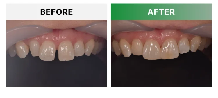 後日、ダイレクトボンディングの形態や色調に問題がないことを確認し再研磨し、右上2番の矮小歯にラミネートベニアを装着した。